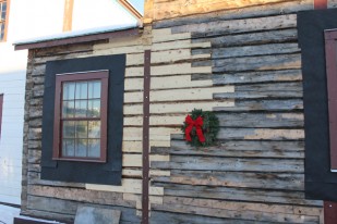 View of the restored exterior showing new square-hewn logs, lap-jointed in, replacing deteriorated portions of the original log structure.