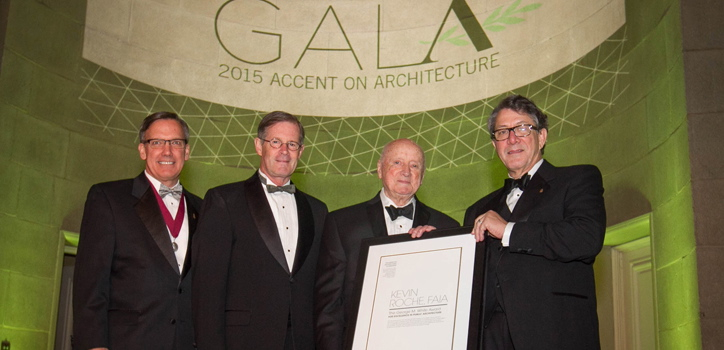 Kevin Roche, FAIA, co-founder and design principal at Kevin Roche John Dinkeloo and Associates (KRJDA) received the 2015 George M. White Award for Excellence in Public Architecture at the 26th annual Accent on Architecture Gala on April 30th. The Gala, held at the Andrew W. Mellon Auditorium in Washington, D.C., celebrates individuals and organizations whose professional accomplishments combine architecture with civic and community betterment.